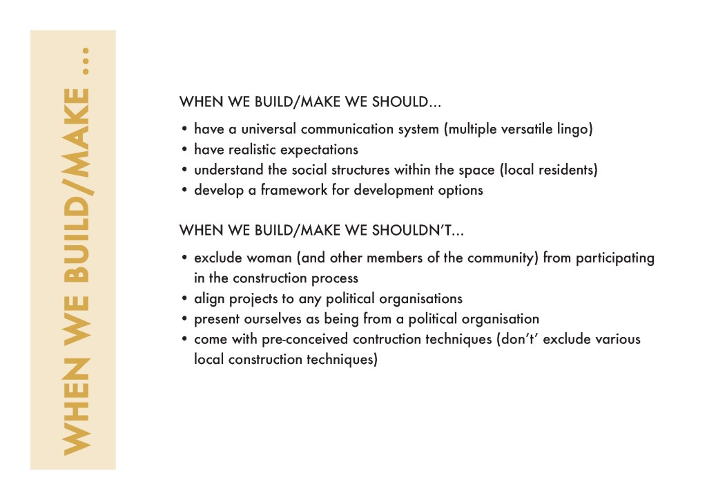 Most recently we have hosted a workshop at the University of Johannesburg’s Post Graduate School of Architecture, under their Critical Practice module we hosted a workshop where students worked with members from our broader network to workshop a proposed set of codes and practice guides.